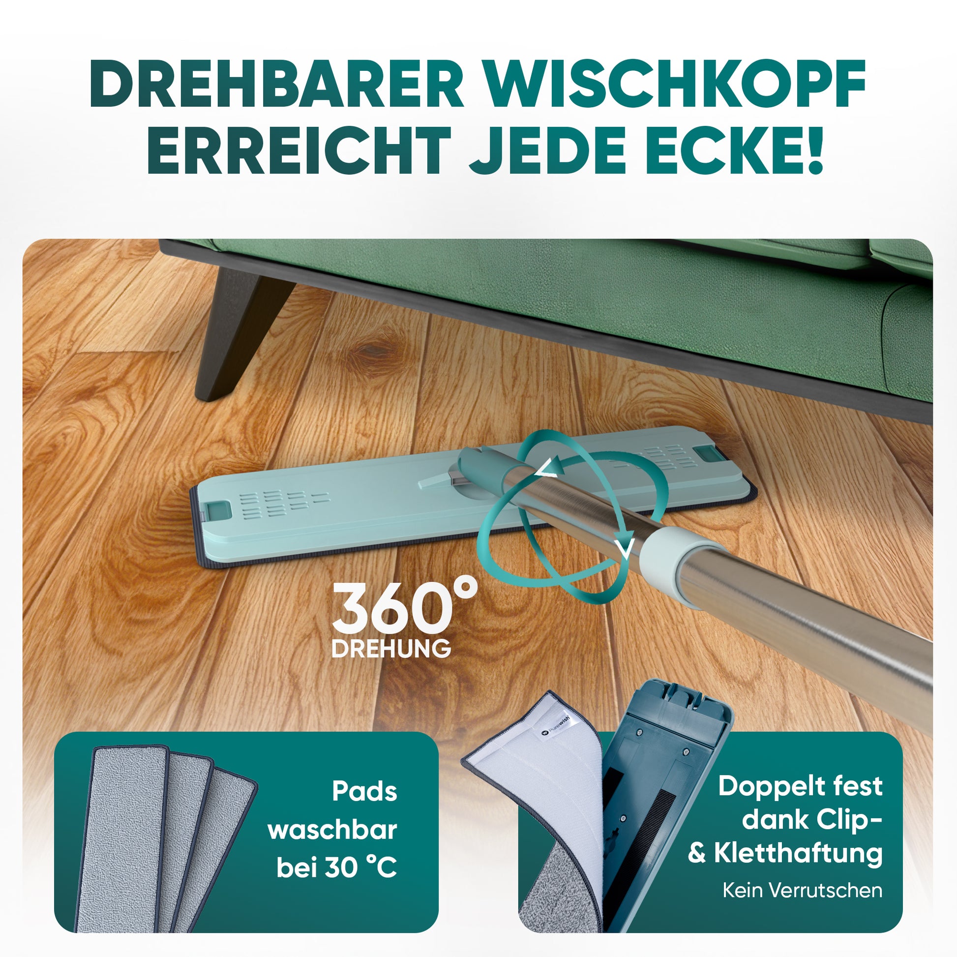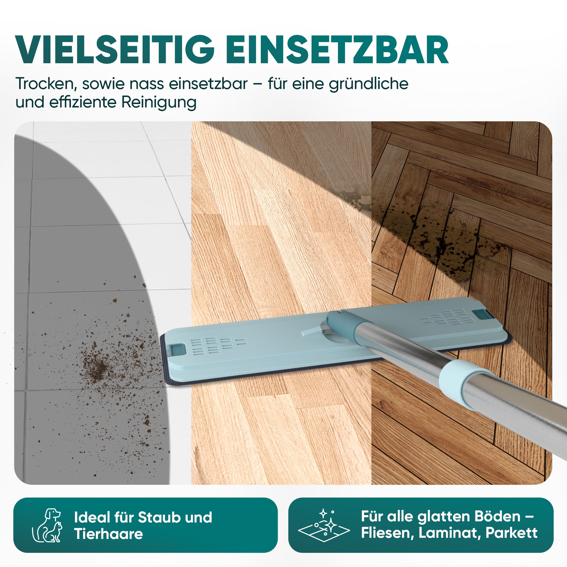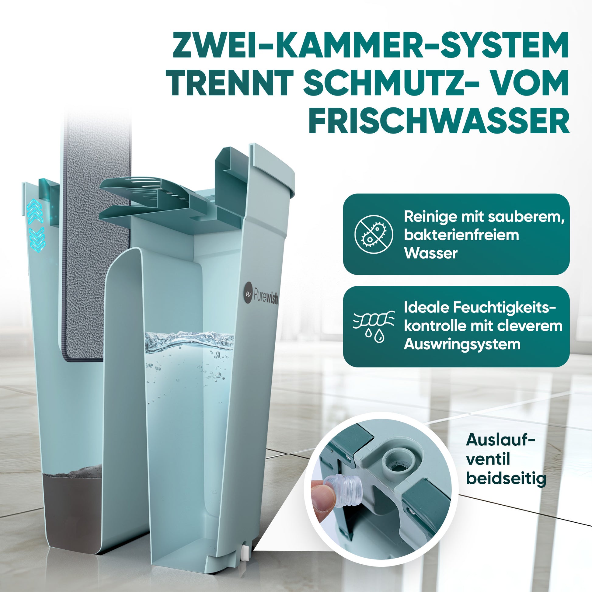 Unser 2-Kammer-Mopp-System trennt Frisch- und Schmutzwasser, reinigt ohne Bücken und ohne nasse Hände – perfekt für Fliesen, Laminat, Parkett & mehr.